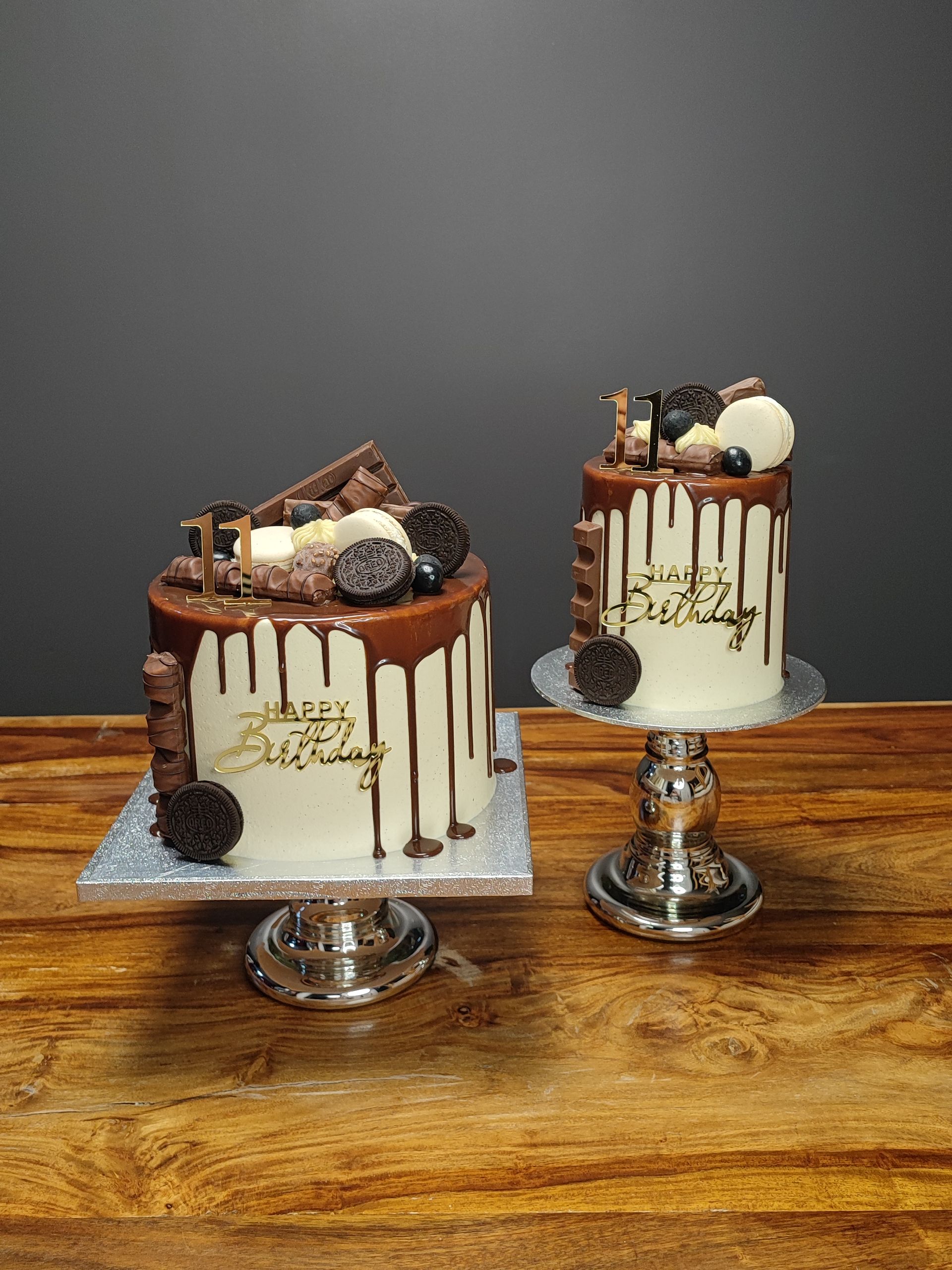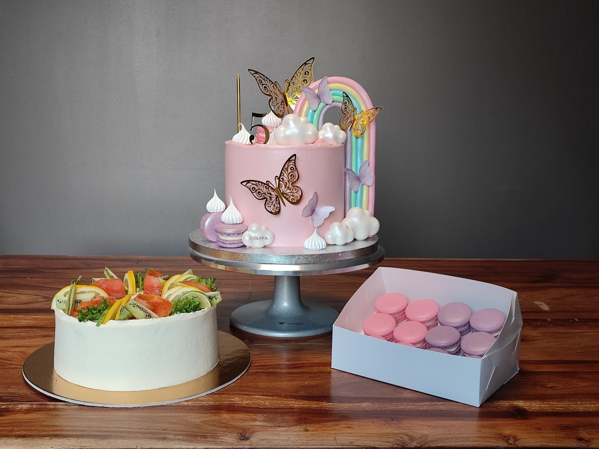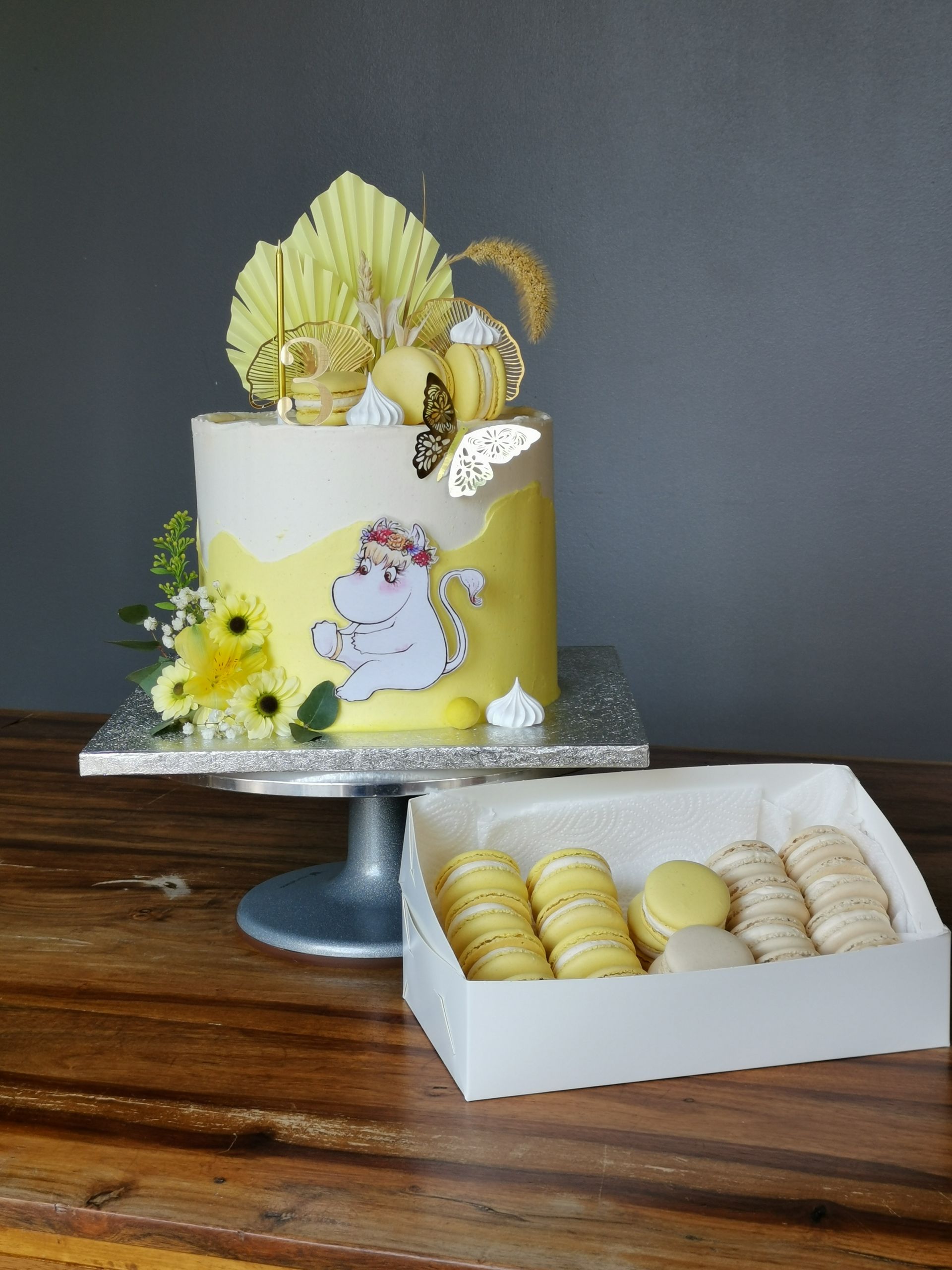 Kakkuihin sisältyy tukeva kakkualusta sekä laatikko.